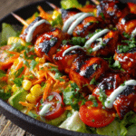 This dish combines the appeal of backyard grilling with the ease of a composed salad bowl. Juicy chicken pieces are threaded onto skewers, brushed with barbecue sauce, and grilled until lightly charred. Once sliced over greens, the chicken adds warmth and savory richness that pairs naturally with crunchy vegetables and a tangy dressing.