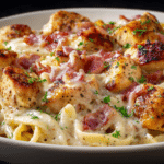 A rich, creamy pasta dish featuring tender chicken, crispy bacon, ranch-seasoned cream sauce, and melty cheddar cheese—perfect for cozy dinners or easy family meals.