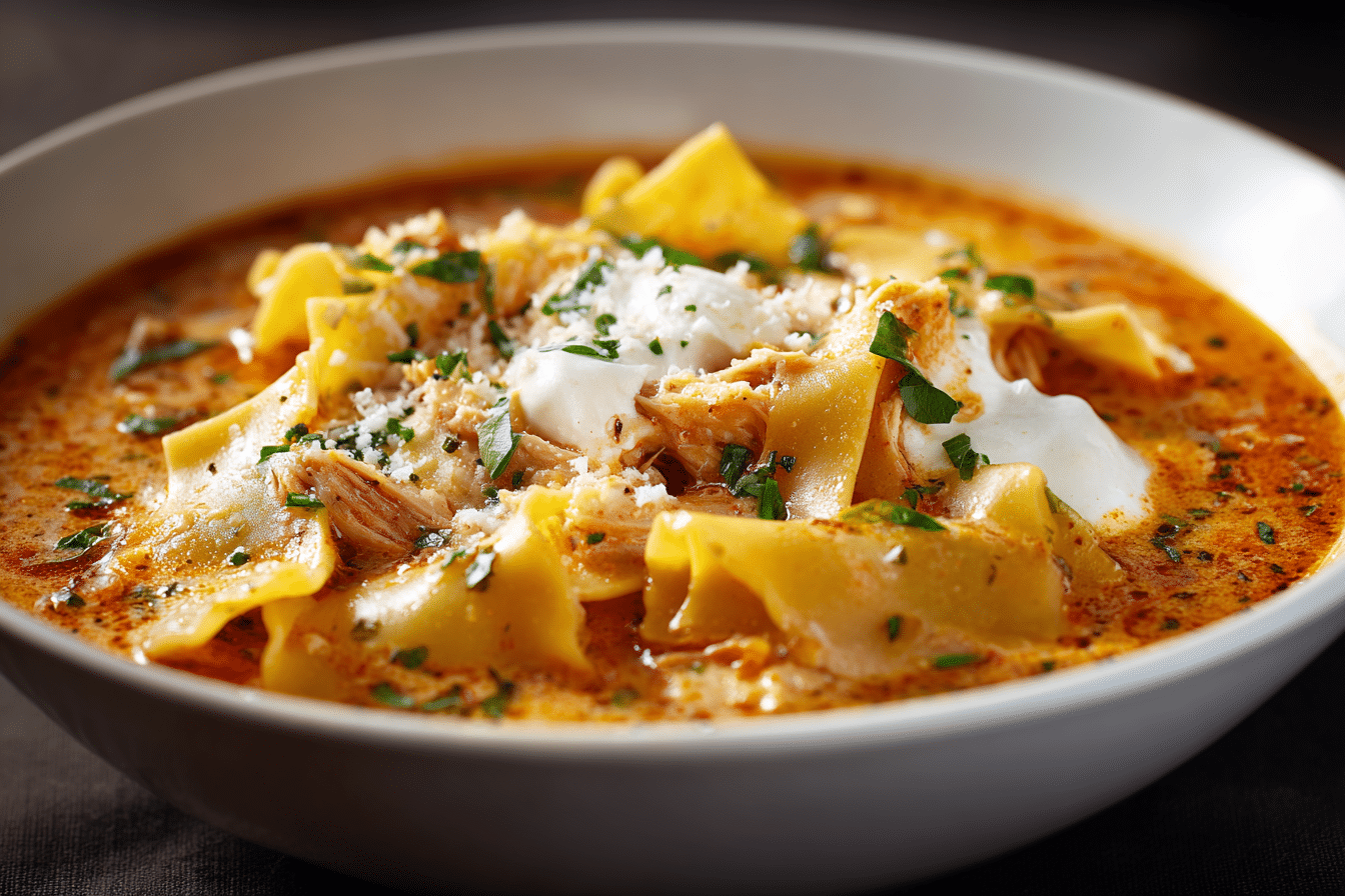 This dish skips the oven and the traditional layering, trading them for ease and a cozy bowl of pure comfort. Shredded chicken, broken lasagna noodles, and a trio of cheeses swim in a tomato-rich broth that’s smooth, flavorful, and deeply satisfying. It’s a practical twist on a classic, perfect for busy nights or weekend meals that call for something special yet effortless.