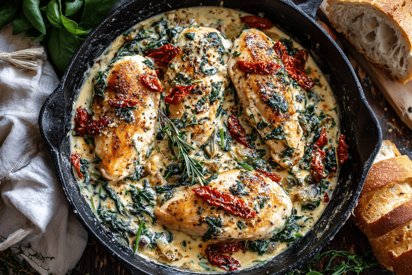 Creamy Tuscan Chicken leans into rich ingredients, but it’s easy to adapt for a more balanced meal. You get a solid source of lean protein from the chicken, and spinach contributes fiber and key vitamins.