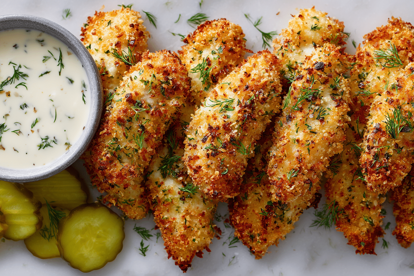 Crispy, golden chicken tenders marinated in dill pickle brine and coated in ranch-seasoned panko, then cooked to perfection in the air fryer. A flavorful, quick, and crunchy dish perfect for weeknights or gatherings.