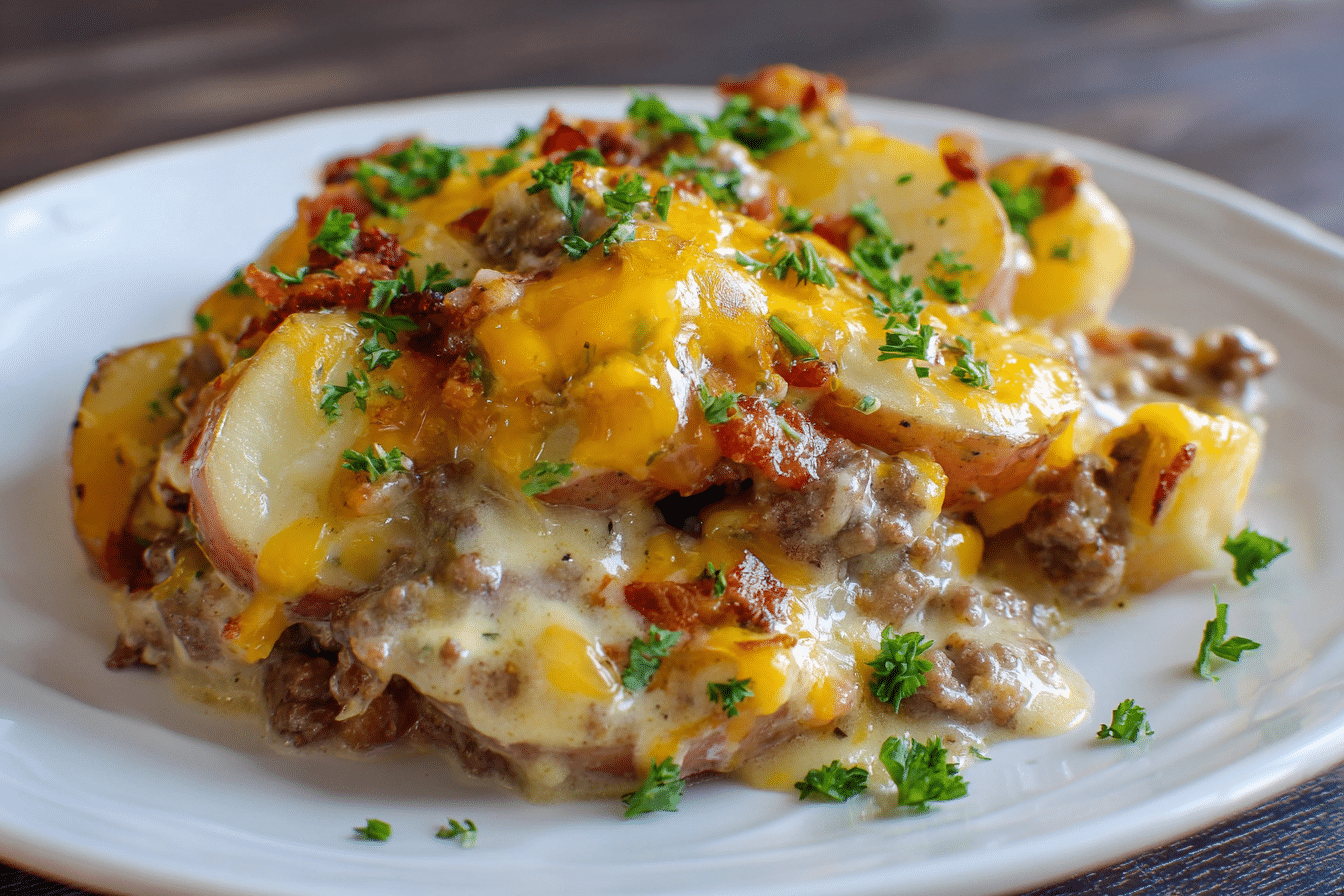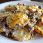 A hearty, layered crockpot meal made with ground beef, sliced potatoes, onions, creamy mushroom soup, and melted cheddar. Slow-cooked to perfection for a cozy, filling dinner.