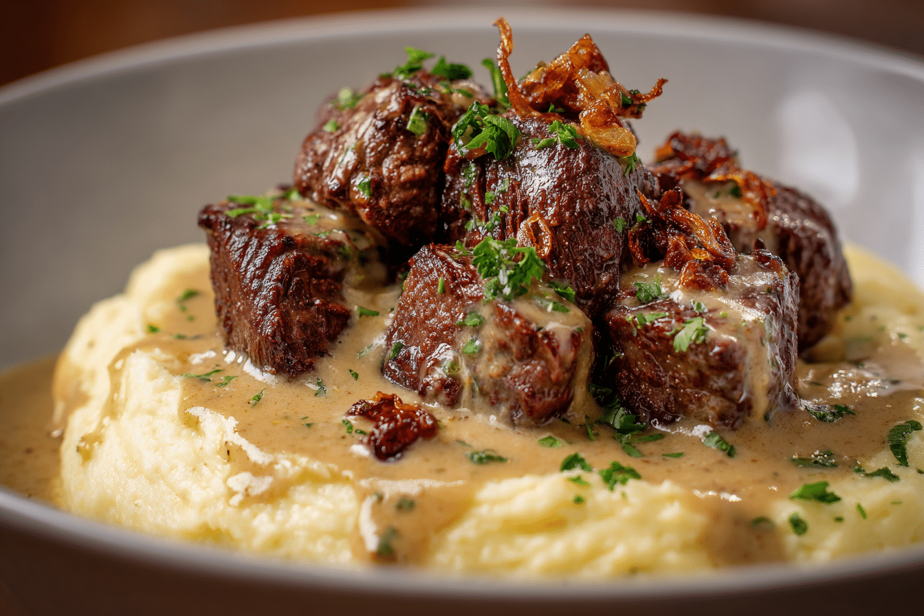 Golden-seared steak bites smothered in a creamy garlic sauce, served over fluffy mashed potatoes blended with butter and Parmesan. Rich, hearty, and ready in under 30 minutes.