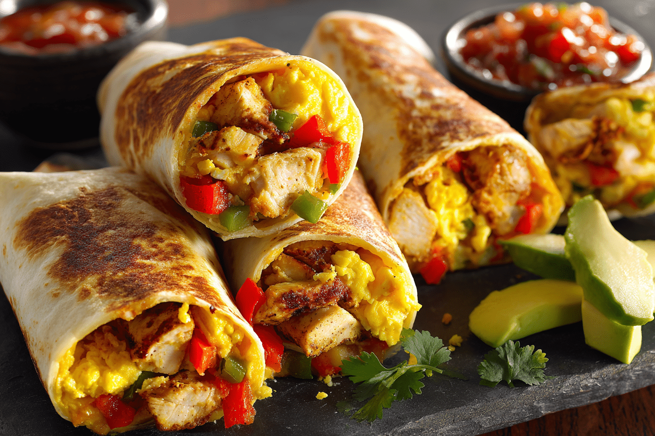 Hearty, high-protein breakfast burritos filled with seasoned chicken, scrambled eggs, vegetables, and melted cheese. Ideal for meal prep and busy mornings.