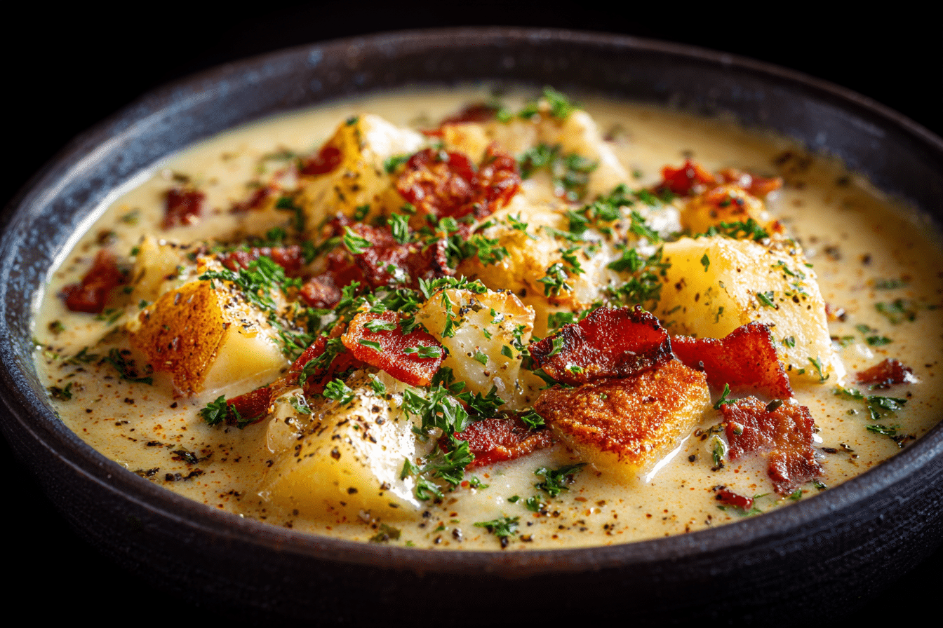 What makes this soup irresistible is its velvety texture, chunks of tender potato, and the salty-smoky punch of bacon. It’s generously topped with shredded cheddar, green onions, and sour cream for that “loaded baked potato” experience in a spoon.