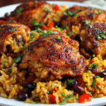 Bring the bold flavors of the islands to your dinner table with this One-Pan Caribbean Chicken and Coconut Rice. This recipe blends crispy, golden chicken with aromatic rice, all simmered together in a flavorful coconut broth filled with sweet bell peppers, savory onions, herbs, and warm spices.