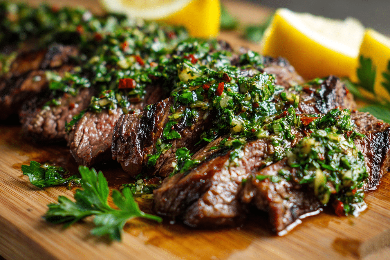 This version focuses on a balanced marinade that tenderizes the steak while building layers of flavor. Once grilled or seared, the steak slices easily across the grain and carries a juicy texture that works beautifully with chimichurri spooned across the top.