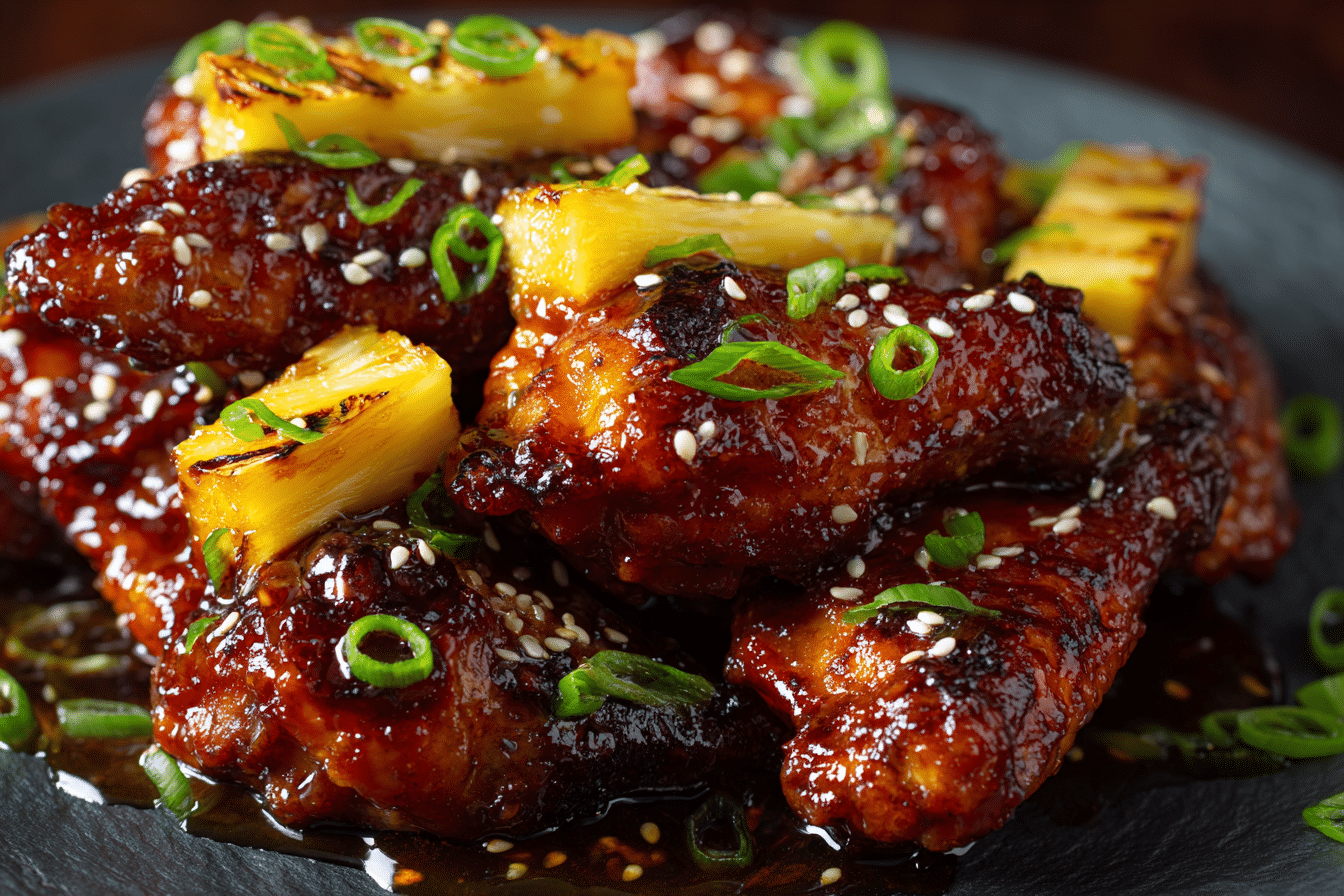 Sticky Pineapple-Teriyaki Chicken Wings deliver a rich balance of sweet fruit, savory soy, and caramelized glaze. Each wing carries glossy sauce that clings to crisp skin while juicy chicken stays tender inside. Pineapple adds bright tropical sweetness that pairs naturally with the deep umami flavor of teriyaki sauce.