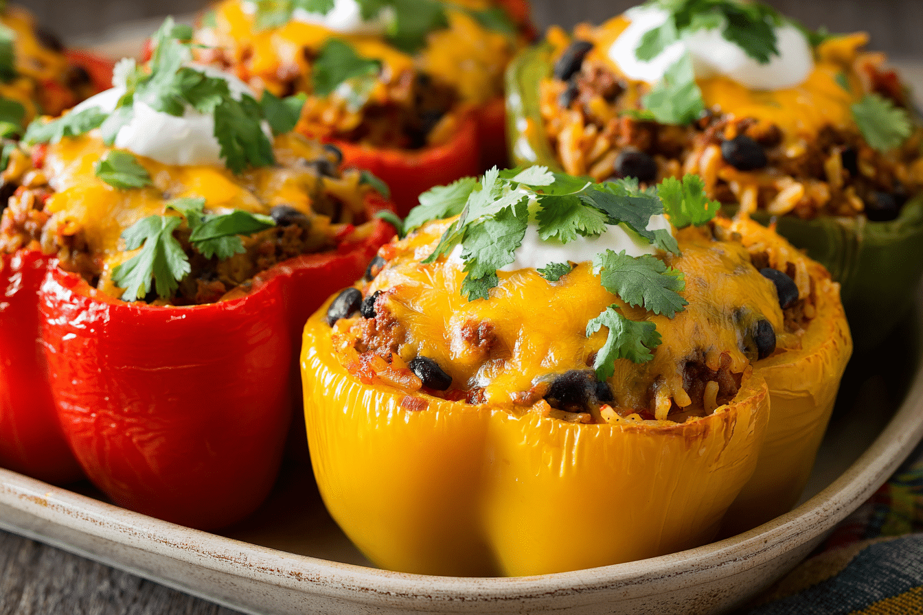 Taco Stuffed Peppers with Ground Beef bring together two comfort food favorites in one colorful, oven-baked dish. Sweet bell peppers cradle seasoned ground beef, tender rice, and melted cheese, creating a satisfying balance of savory filling and slightly caramelized edges.