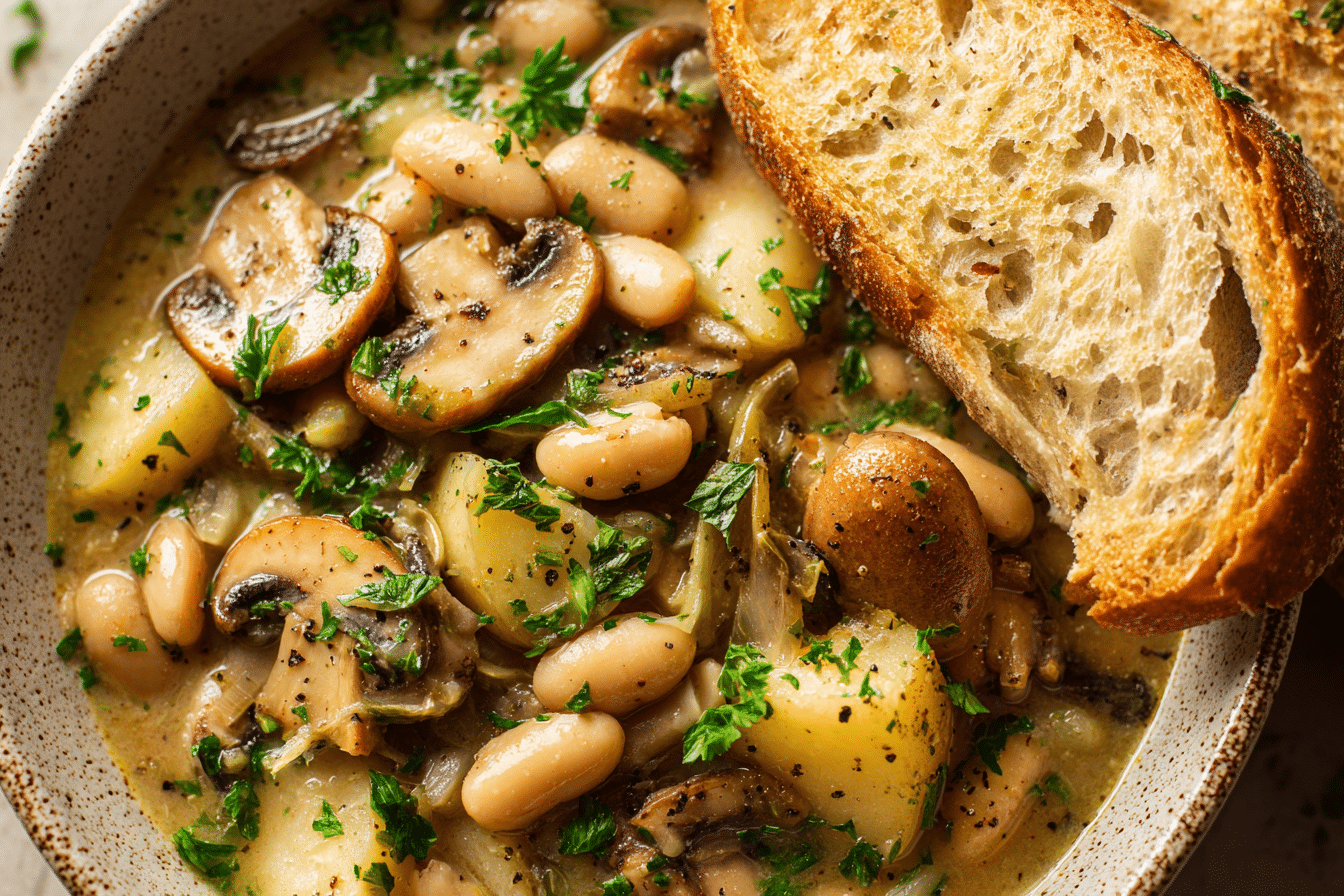 A hearty, plant-based stew made with tender white beans, savory mushrooms, and aromatic herbs. Perfect for cozy meals and meal prep.